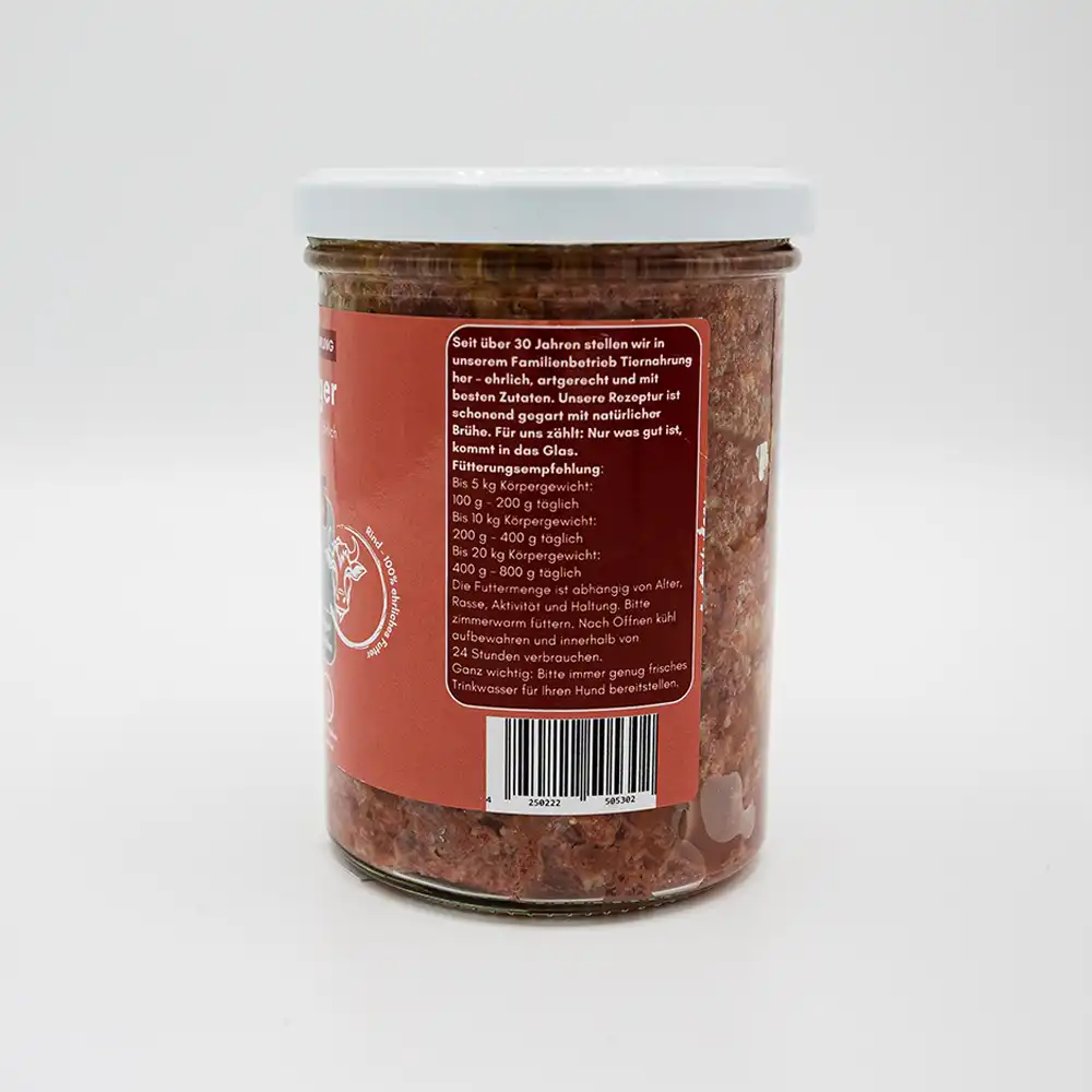 Unser BARF aus der Dose oder aus dem Glas vereint die Vorteile einer frischen BARF-Ernährung mit der praktischen Handhabung eines haltbaren und sofort einsatzbereiten Produktes. Ideal für unterwegs, für den Vorrat, für spontane Fütterungen – oder für alle Hundebesitzer, die BARF einfach, hygienisch und unkompliziert anbieten möchten.