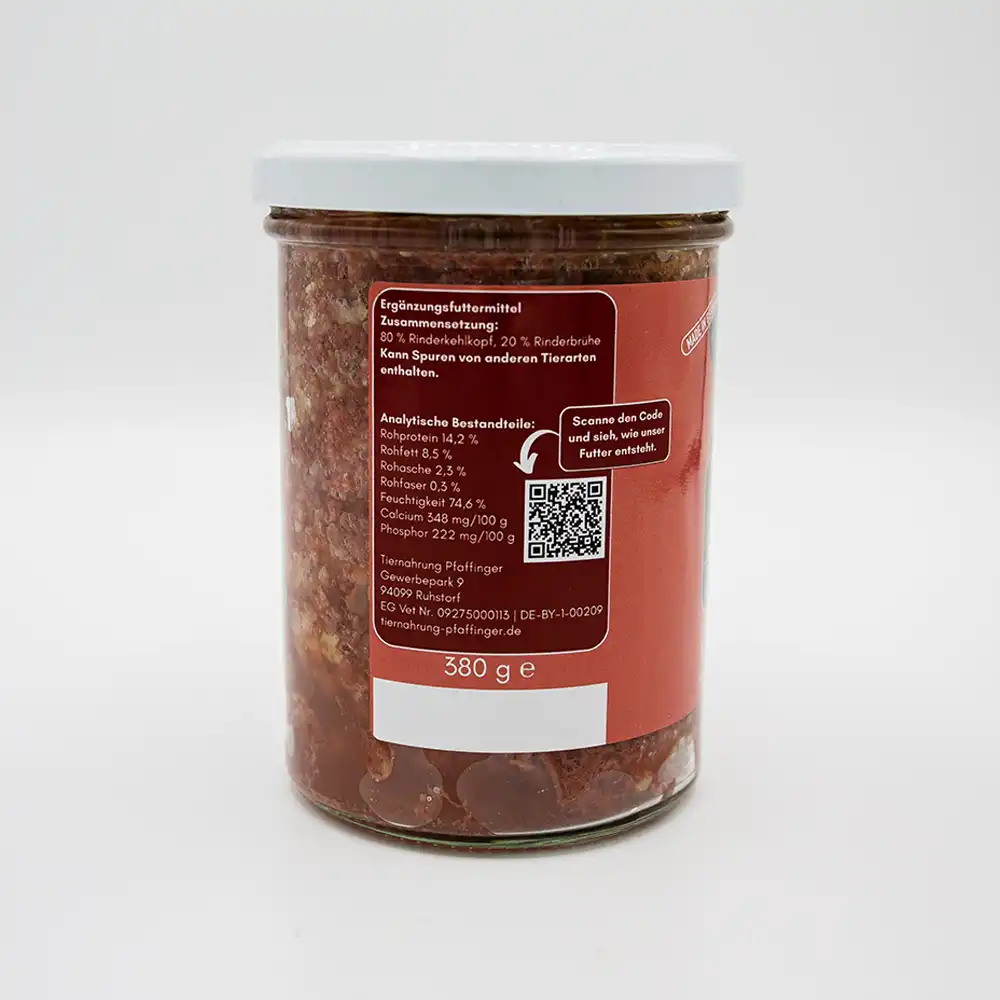 80 % Rinderkehlkopf, 20 % Rinderbrühe. Reich an Kollagen, nährstoffreich, bekömmlich und ideal für aktive oder wählerische Hunde.