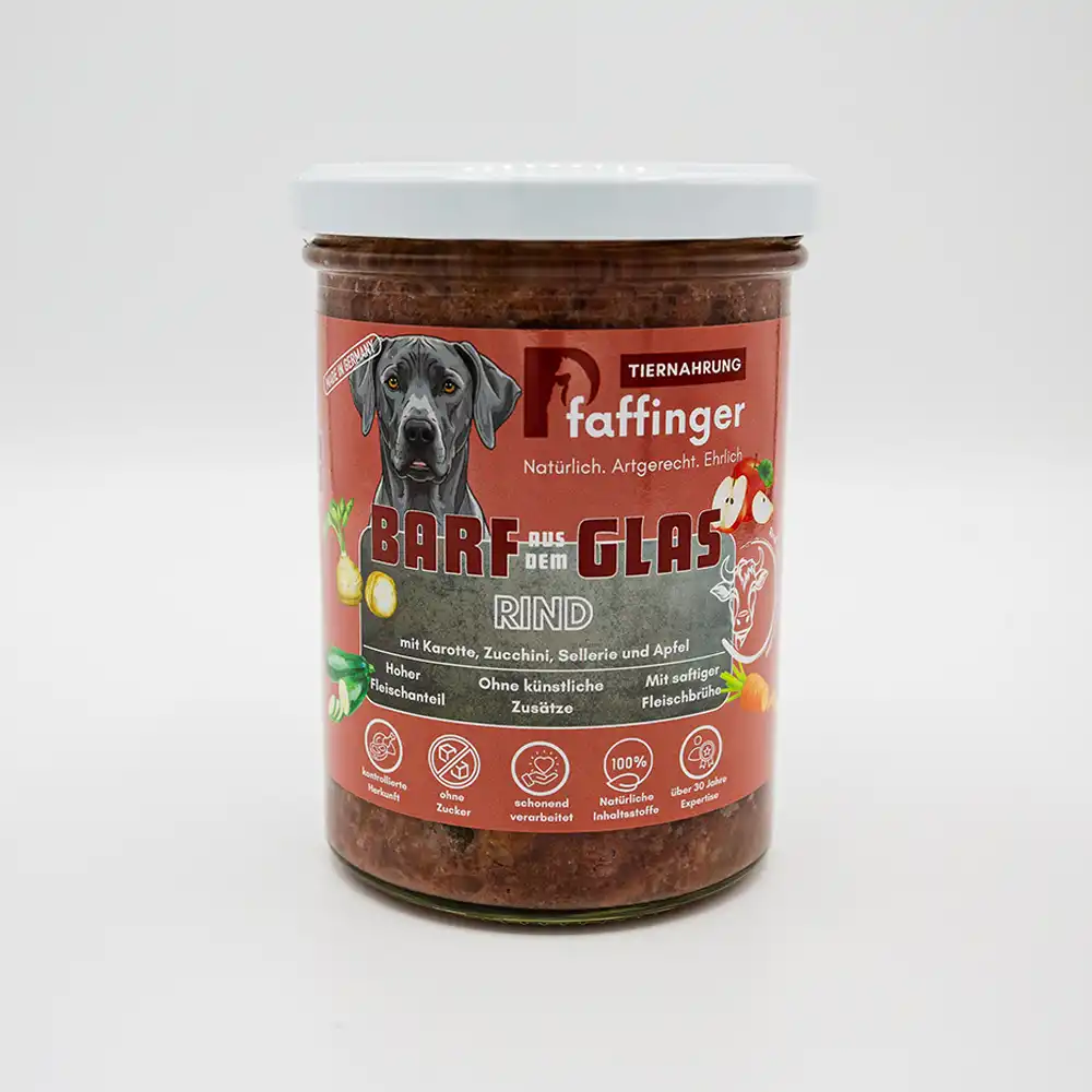 Unser BARF aus der Dose oder aus dem Glas vereint die Vorteile einer frischen BARF-Ernährung mit der praktischen Handhabung eines haltbaren und sofort einsatzbereiten Produktes. Ideal für unterwegs, für den Vorrat, für spontane Fütterungen – oder für alle Hundebesitzer, die BARF einfach, hygienisch und unkompliziert anbieten möchten.