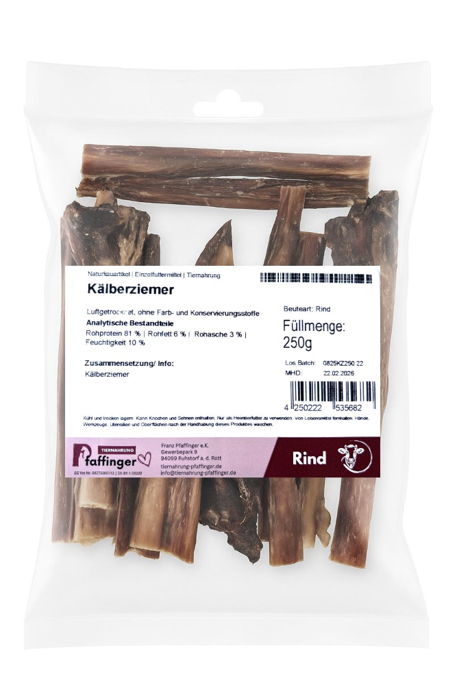 Der Kälberziemer ist besonders fettarm und eiweißreich und eignet sich daher auch hervorragend für Hunde, die auf eine ausgewogene Ernährung achten müssen. Dank der schonenden Lufttrocknung bleiben Geschmack und Nährstoffe optimal erhalten. Selbstverständlich verzichten wir vollständig auf Farb- und Konservierungsstoffe.