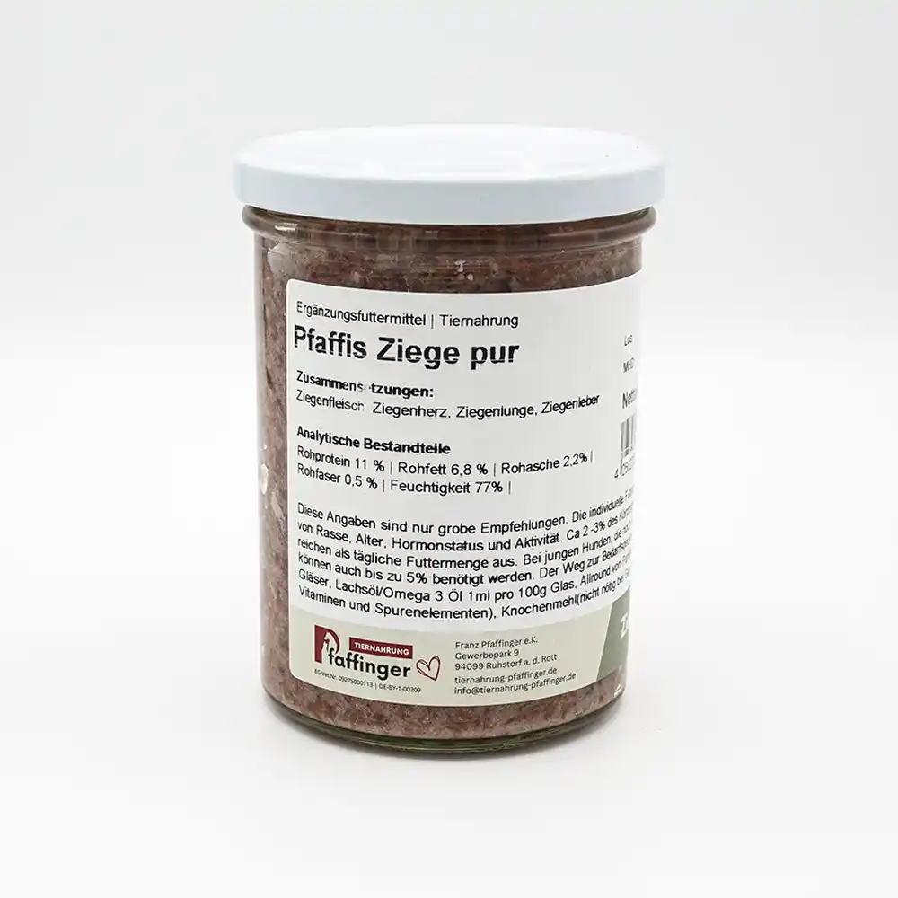 Verwöhne deinen Hund mit einer puren, natürlichen Mahlzeit: Unser Pfaffis Glas Ziege pur besteht aus 80 % hochwertigem Ziegenfleisch, Herz, Lunge und Leber und 20 % Ziegenbrühe. Diese Kombination liefert eine besonders leicht verdauliche, nährstoffreiche Mahlzeit – ideal für empfindliche Hunde, Feinschmecker oder als Grundlage für eine ausgewogene BARF-Ernährung.